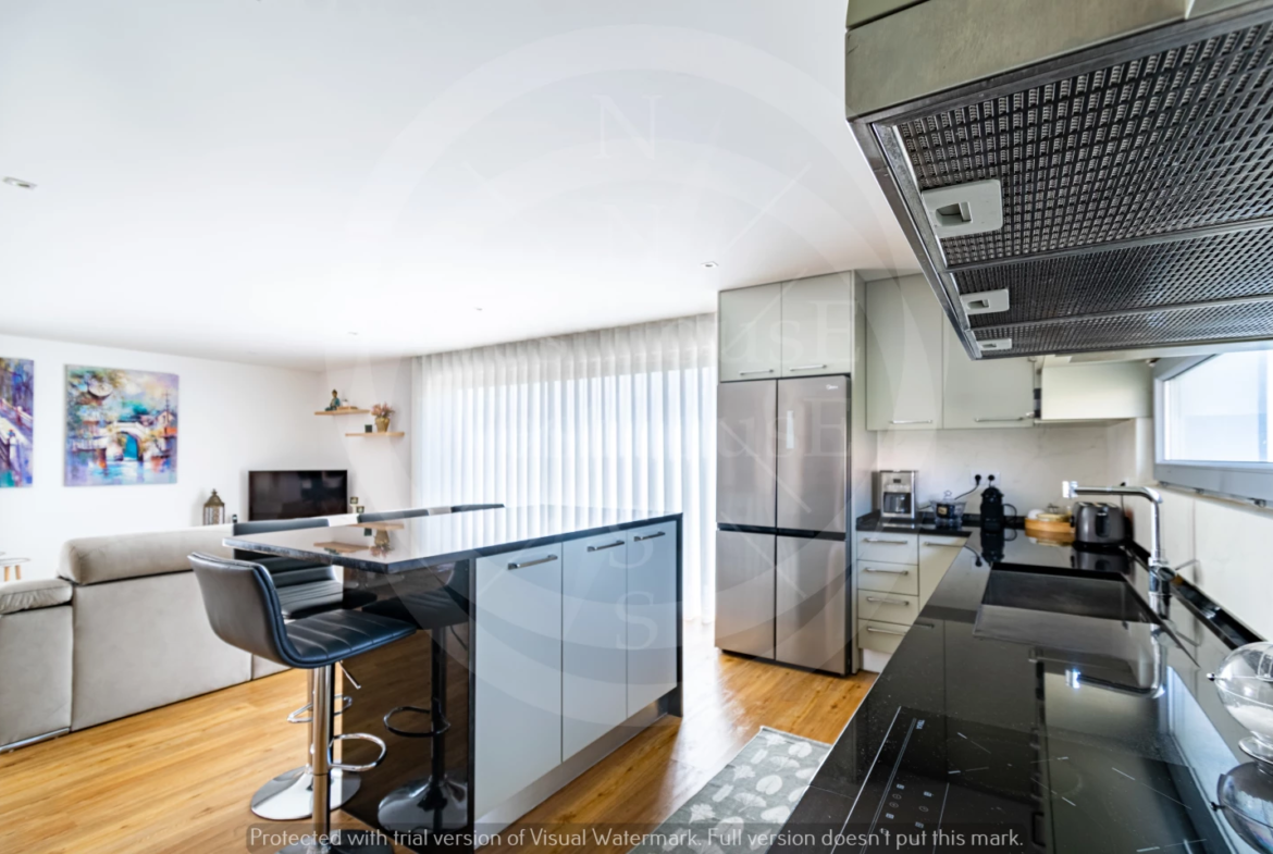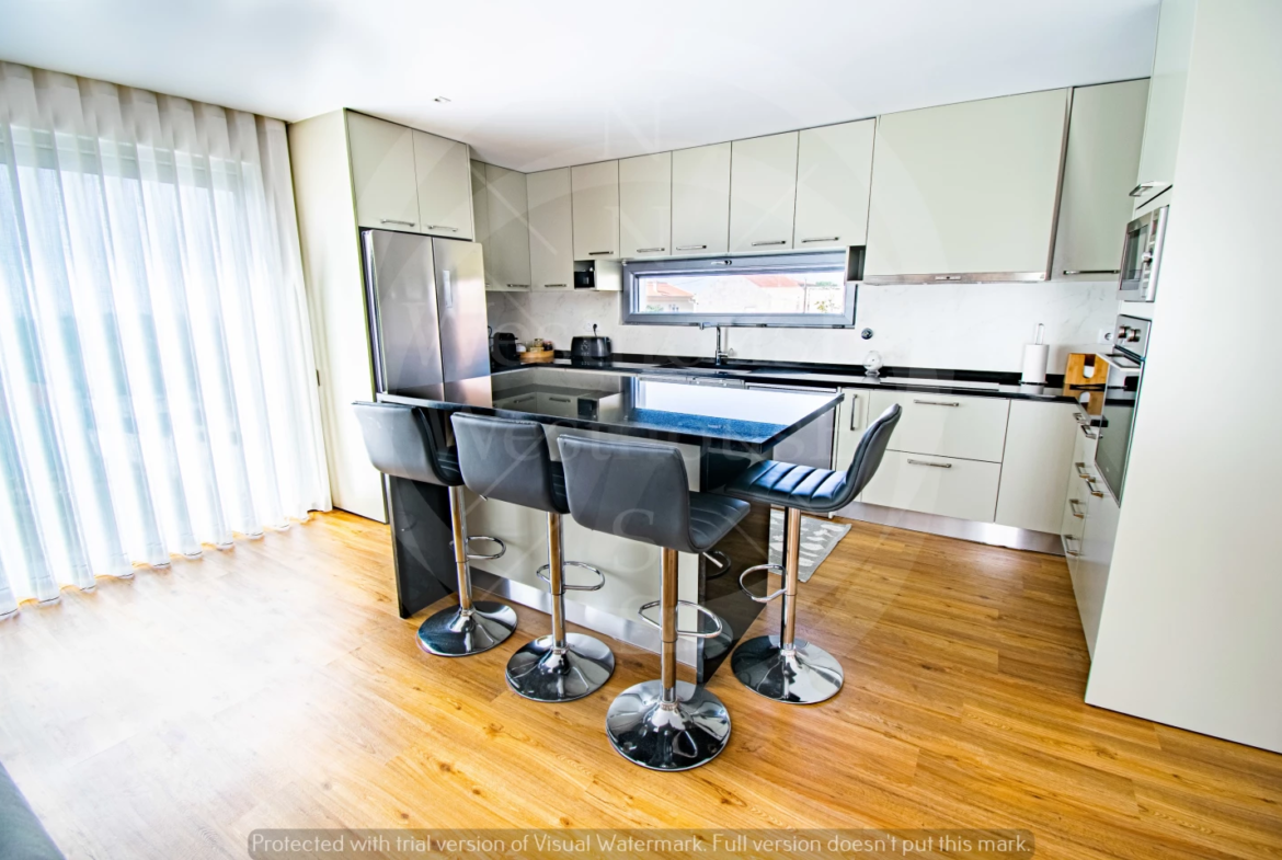 – Cozinha americana totalmente equipada com a bancada e a ilha em pedra Zimbabué de cor preta